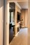 Zabudowa indywidualna ściany . Panel z lakierowanego na czarno szkła jako tło do zawieszenia telewizora. Pod spodem wkomponowana w zabudowę G-K półka na sprzęt towarzyszący oraz osobna półka na dekoracje.